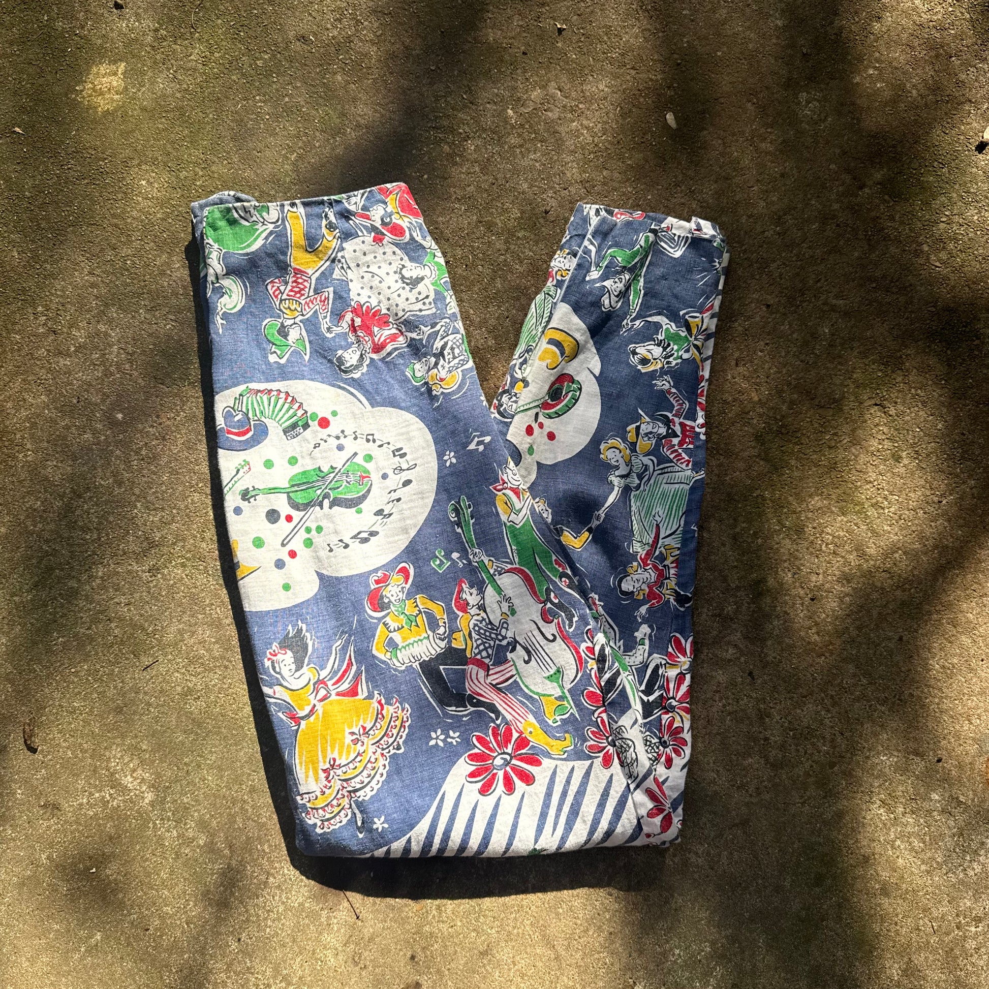 100" Linen, an amazing novelty square dance western print, very rare. Zips up at the ankles about 5". Marked size 6, best fits a 26/27.