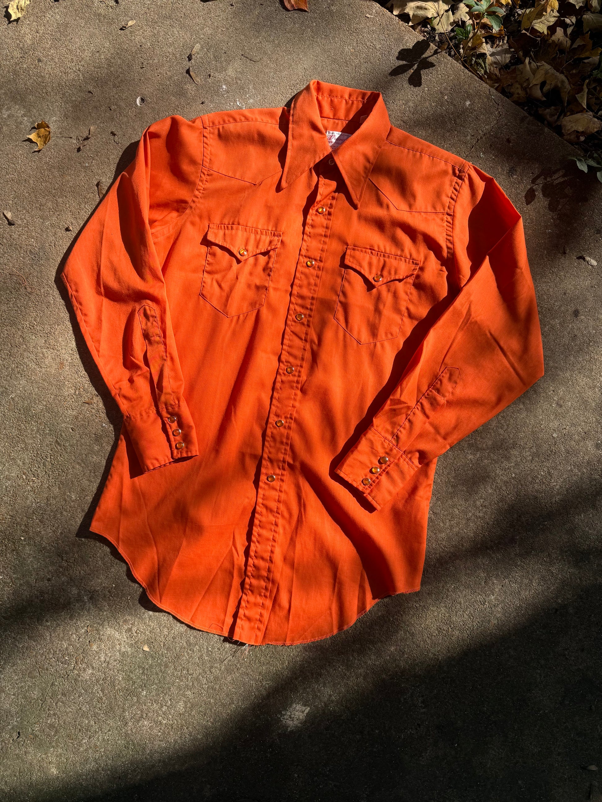 Rare 1960's Wrangler Permanent Press western snap shirt in vibrant safety orange. Made in USA with classic pearl snaps and pointed yokes. Collectible true vintage western wear.