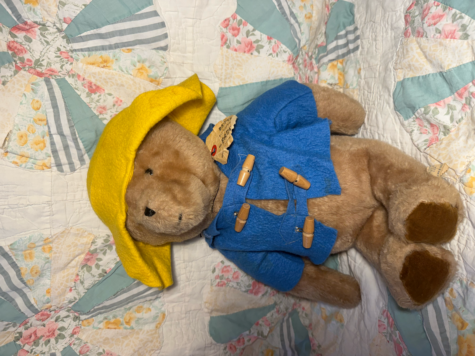Classic Paddington Bear plush wearing his signature yellow felt hat and blue toggle coat. Soft, jointed plush body with original details and paper tag attached, though ripped. Approx 14" tall.