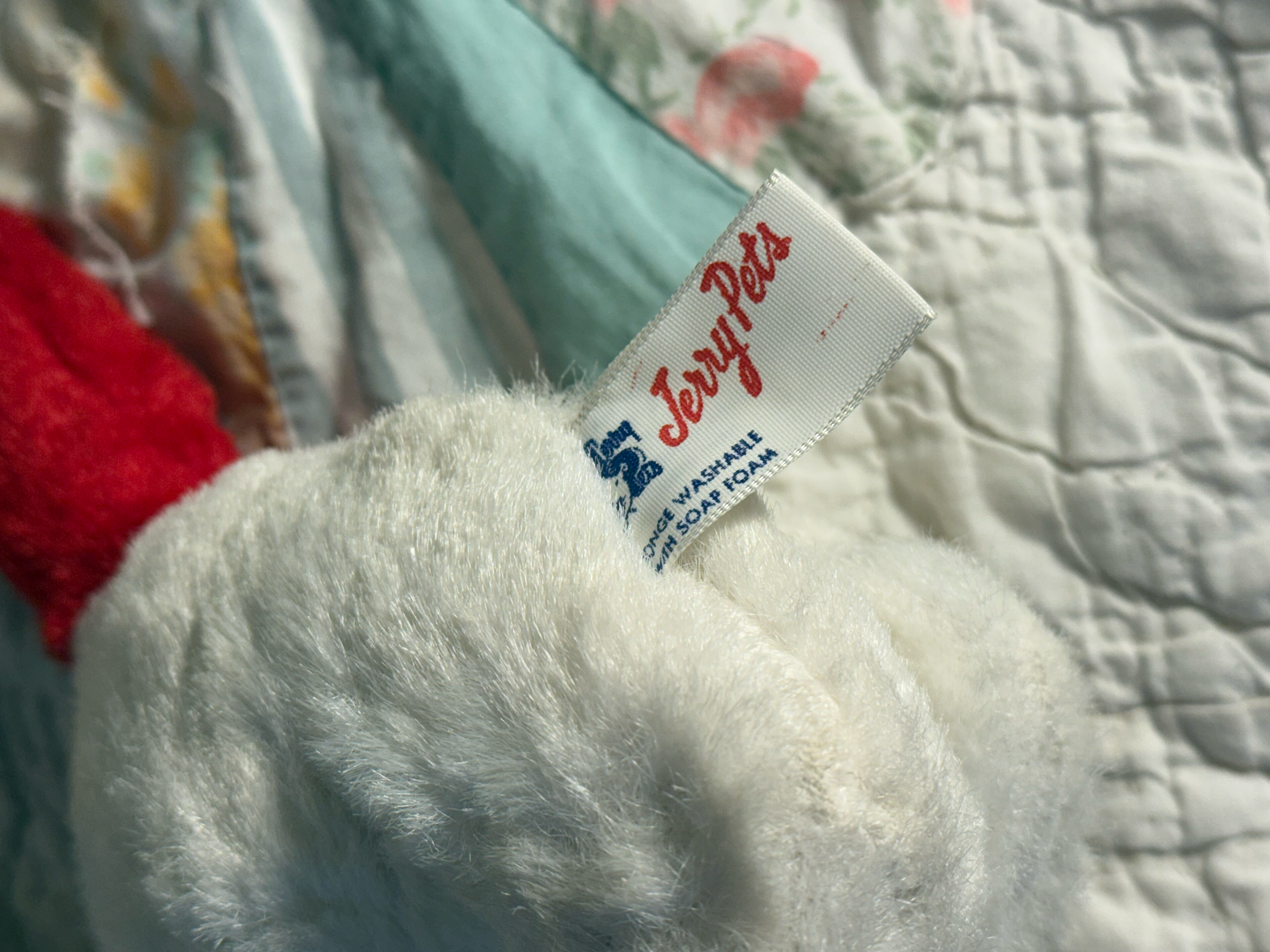 Sweet vintage cloth doll with braided yellow yarn hair, blue-and-white polka dot jumpsuit, and matching bonnet. Approx 13" tall.